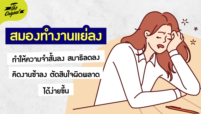 ผลกระทบอย่างแรกของการนอนดึกที่เห็นชัดที่สุดคือสมองทำงานแย่ลง เพราะเมื่อเราพักผ่อนไม่เพียงพอ สมองจะไม่สามารถจัดระบบข้อมูลและบันทึกความจำได้อย่างมีประสิทธิภาพ