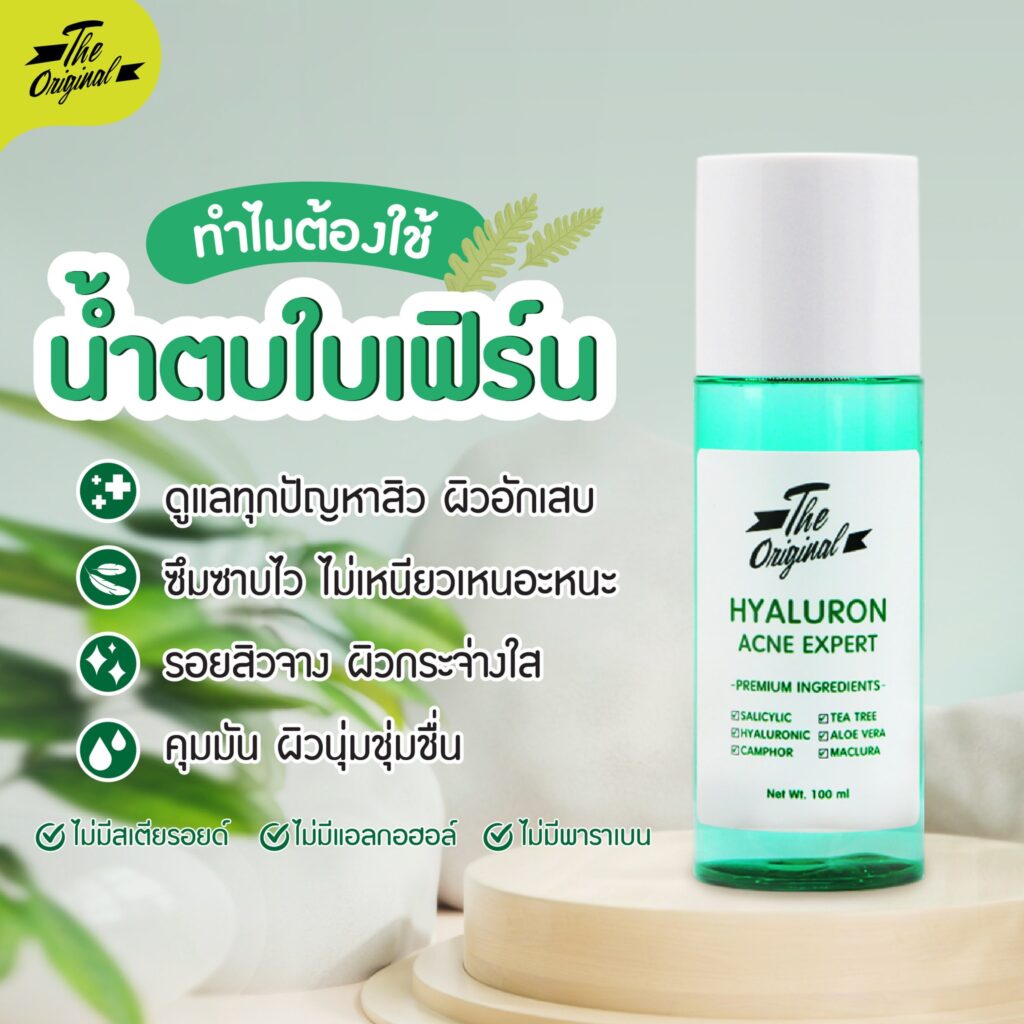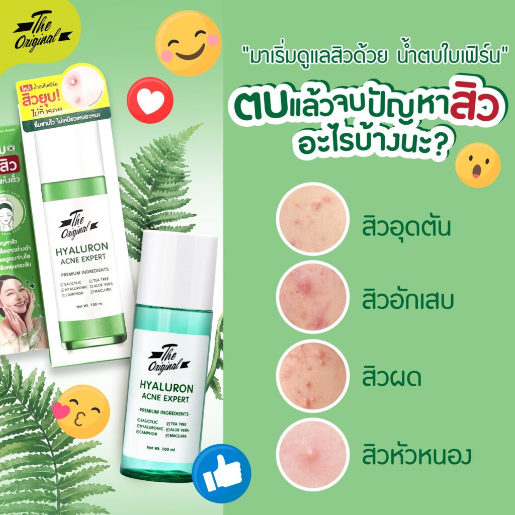 น้ำตบใบเฟิร์น The Original Hyaluron Acne Expert น้ำตบลดสิว สิวยุบไม่ทิ้งรอย น้ำตบลดสิวเพื่อผิวหน้าใส มีสารสกัดจากรากเฟิร์น ซึ่งช่วยลดการอักเสบที่ทำให้เกิดสิว P.Acnes สิวหัวช้าง สิวอักเสบ และสารสกัดจาก Maclura ปกป้องผิวจากการระคายเคือง ลดความมันบนใบหน้า ซึ่งได้รับรางวัล Best Active ingredient Silver จาก In-Cosmetics Global 2018